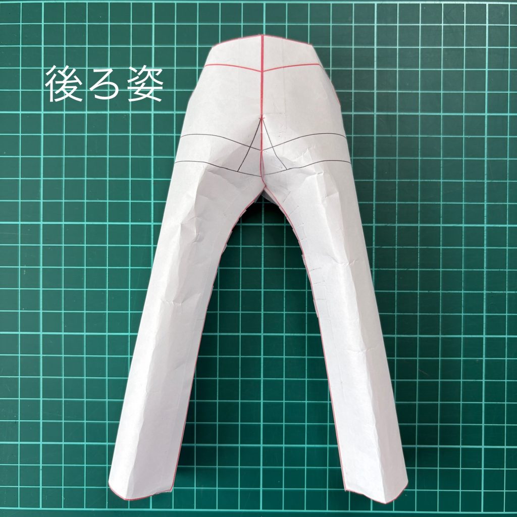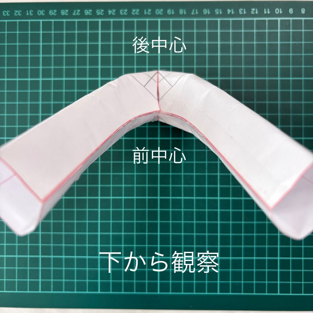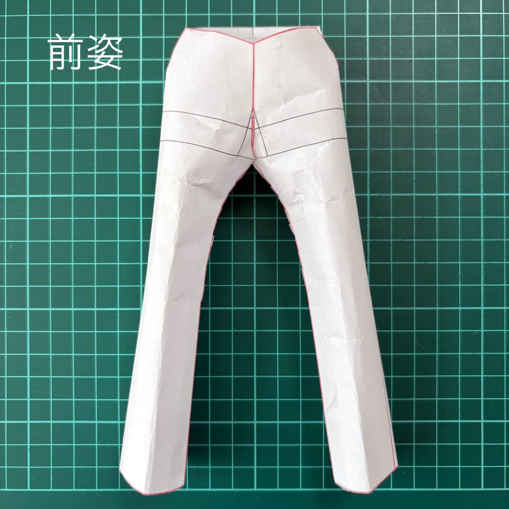 そしてパンツアイテムに関して、写真のようにレジュメでご紹介しているジーンズパターンを紙で組み立てた様子をご覧いただくと一目瞭然ですが、運動量を加味した出来上がりシルエットは